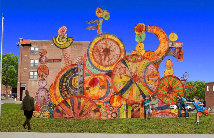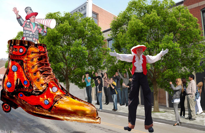 This project involved the development of two concept pieces, as well as logo designs, for multiple public art shows; all under the Visionary Village banner. The first image was of a public art display which paired with an interactive event. These images were used in proposal documents and presentation boards, which I also designed, in order to get grant funding.