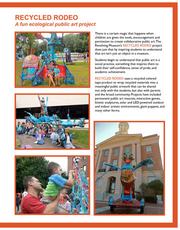 This project was a two part marketing system for The Revolving Museum's art outreach program. The first step was a four page brochure to market the program, reminding schools and youth groups the importance of the the arts in education. The next were stand alone fliers with more details so smaller organizations could learn more about the activities they were most interested in. Now both facets of this marketing system needed to follow a singular visual vocabulary so that those interested in all proposed activities would walk away with a full leaflet to peruse. This finalized booklet was also used in grant proposal presentations to encourage funding for the program as a whole.
